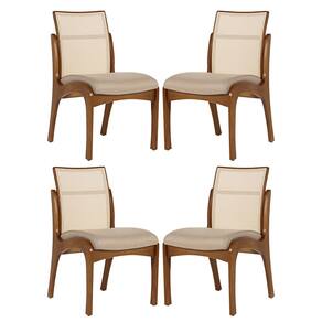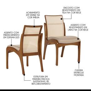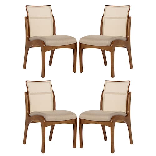 CARACTERÍSTICAS TÉCNICAS: - Produzido em Madeira Maciça Sustentável - Acabamento em Verniz na cor Imbuia - Encosto com Revestimento em Tela Sintética na cor Bege - Assento Estofado Preenchido com Espuma D23 - Revestimento do Assento em Linho na cor Bege M58 - Cadeira Entregue Montada *Kit Composto por QUATRO Cadeiras