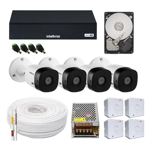 Kit 4 Câmeras Bullet Dvr Intelbras Hd 500g e Sobrepor Kit cftv Intelbras completo com HD 500 gigas, câmera de segurança Intelbras VHC 1120 bullet e dvr Intelbras 1004c 4 canais. Este kit camera de segurança Intelbras pode ser para monitorar áreas internas ou externas. Acompanha caixas de sobrepor para organização e melhor acabamento em sua instalação. Acesso via celular pelo aplicativo Isic Lite. Itens Inclusos no Kit de cameras Intelbras: 01 Dvr Stand Alone Intelbras 4 canais MHDX 1104. 01 HD 500 gigas para o DVR Stand Alone. 04 Câmeras Intelbras infravermelho HD 720P lente 2,8mm VHC 1120B. 01 Fonte de alimentação 12V 5A. 08 Conectores BNC de Mola. 04 Conectores P4 Macho com borne. 01 Rolo de 100 metros de cabo coaxial 4mm 80% malha. 04 Caixas de sobrepor para conectores. Características do DVR Intelbras Multi HD 1004c: Compatível com 3 tecnologias: HDCVI + HDTVI 2.0 + AHD. Visualização em 1080p. Gravação de todos os canais em 1080N ou 720p. Saídas de vídeo VGA, HDMI e BNC. Reprodução em tempo real, detecção de movimento e busca avançada. Compatibilidade com ONVIF Perfil S. Suporta 1 HD SATA de até 8TB Acompanha HD de 500GB Edição de áudio e vídeo. Modo NVR - Transforma todos os canais BNC em IP. Função BNC + IP - Adiciona câmeras IP ao DVR. Ipv6. Características técnicas da câmera Intelbras: Resolução real HD: 720p. Lente: 2.8 mm. Alcance infravermelho: 20 metros. Quantidade de LEDs: 2. Day & Night Automático: Ajustável , Colorido, P&B. Saída de vídeo: BNC fêmea. Alimentação: Conector P4 fêmea. Tensão: 12Vdc Cor case: Branco. Tipo: case / material Bullet / Plástica. Local de instalação: Interno e Externo. Imagens Ilustrativas com Design sujeito a Alteração. do vendedor: 06 meses Homologação Anatel: 149822010251 Marca: Não Informado Ean: 7891408019656