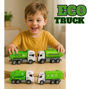 Este incrível kit inclui 4 caminhões de brinquedo ecológicos, cada um com um modelo funcional diferente: 1 caminhão de lixo reciclável; 1 caminhão pipa tanque água ; 1 caminhão com caçamba articulada; 1 caminhão coleta carga.