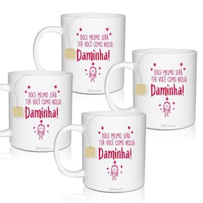 As Canecas Convite são uma forma linda e deliciosa de convidar ou agradecer os pequenos por participarem de uma data tão única Com capacidade de 300 ml, você tem a opção de encher as canecas com todo tipo de doce e assim encantar as futuras Daminhas. O sim delas será GARANTIDO Conteúdo: 4 Canecas Convite Branca Personalizado Daminha Capacidade: 300 ml Cor: Branco Material: Policarbonato Quantidade: 4 Peças