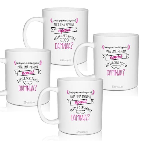 As Canecas Convite são uma forma linda e deliciosa de convidar ou agradecer os pequenos por participarem de uma data tão única Com capacidade de 300 ml, você tem a opção de encher as canecas com todo tipo de doce e assim encantar as futuras Daminhas. O sim delas será GARANTIDO Conteúdo: 4 Canecas Convite Branca Personalizado Daminha Capacidade: 300 ml Cor: Branco Material: Policarbonato Quantidade: 4 Peças