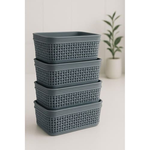 Organize seus ambientes com praticidade e estilo com o Kit de 4 Cestos Organizadores Retangulares. Feitos em plástico resistente, esses cestos são perfeitos para manter tudo em ordem, desde armários e gavetas até escritórios, banheiros, lavanderias e cozinhas. Com design moderno e acabamento que simula trama trançada, os cestos combinam com qualquer decoração. Além disso, são empilháveis, otimizando espaço quando não estão em uso, e possuem furos laterais para ventilação, ideais para armazenar itens com mais segurança.