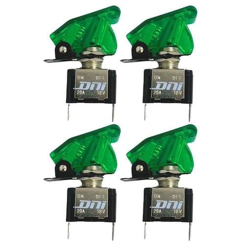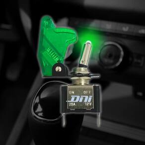 Especificações: - voltagem: 12v - carga máxima: 400w; - 2 posições liga/desliga; - 3 terminais; - iluminação led verde, com capa/tampa na cor verde translucida, que protege a alavanca; - corpo em baquelite; - aplicação: uso geral, tunning; - dimensões aproximadas: 6,1 x 4,3 x 1,7cm.