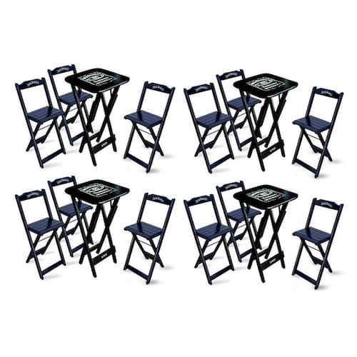 Kit 4 Conjuntos De Mesa Bistrô Dobrável Jack Daniel S Com 3 Banquetas De Madeira PretaO Conjunto Jack Daniel?s é ideal para bares, restaurantes, estabelecimentos, áreas de lazer e também para sua casa. Em madeira maciça, tornando-os resistentes e duráveis. Seu design permite que esse conjunto seja encaixado em qualquer ambiente, trazendo um toque a mais para seu estabelecimento. Além de sua durabilidade, o que lhe trará conforto para servir seus clientes. Por ser dobrável torna-se mais fácil guardar, manusear e limpar o produto.CARACTERÍSTICAS BANQUETATipo: BanquetaModelo: Jack Daniel sCor: PretoBase: MadeiraDIMENSÕES DA BANQUETAAltura: 95cmLargura: 41,5cmComprimento: 43cmAltura do Assento até o chão: 61cmLargura do Assento: 37,5cmComprimento do Assento: 32cmAltura dobrada em pé: 105cmCARACTERÍSTICAS MESATipo: MesaModelo: Jack Daniel?SCor: PretoBase: MadeiraDIMENSÕES DA MESAAltura: 98cmLargura: 45cmComprimento: 54cmATENÇÃOIMAGENS MERAMENTE ILUSTRATIVAS REALIZADO EDIÇÃO, PODENDO HAVER UMA PEQUENA VARIAÇÃO DE COR DEPENDENDO DE CADA TELA OU MONITOR.Kit 4 Conjuntos de Mesa Bistrà DobrÃvel Jack Daniels com 3 Banquetas de Madeira Preta
