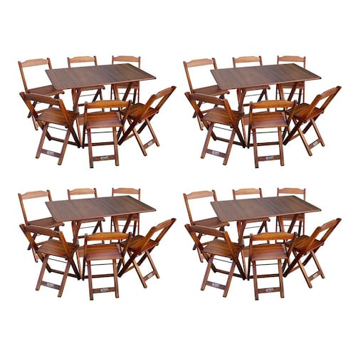 Kit 4 Conjuntos De Mesa Dobráveis De Madeira 70x110cm Com 6 Cadeiras Imbuia O Conjunto Dobrável é ideal para bares, restaurantes, estabelecimentos, áreas de lazer e também para sua casa. Em madeira tornando-os resistentes e duráveis, seu design permite que esse conjunto seja encaixado em qualquer ambiente, trazendo um toque a mais para seu estabelecimento. Além de sua durabilidade, o que lhe trará conforto para servir seus clientes. Por ser dobrável torna-se mais fácil guardar, manusear e limpar o produto.