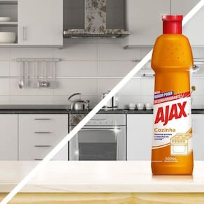 Agora ficou mais fácil limpar forno, fogão, paredes e outras superfícies com Limpador Ajax desengordurante (vs. outra fórmula do mesmo fabricante) para a cozinha, graças à sua fórmula inovadora que remove a gordura e manchas de comida (testado com leite e molho de tomate em superfícies de aço inoxidável). Experimente o poder do Ajax.