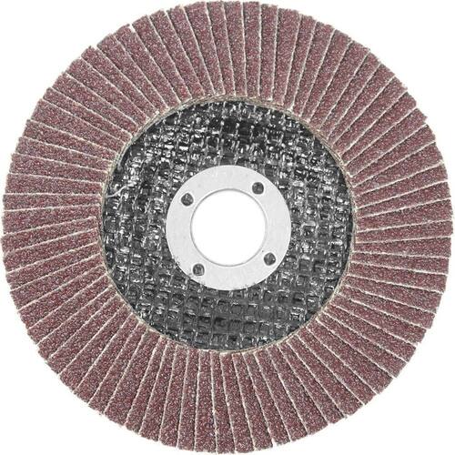 Disco de desbaste tipo flap sextavado e feito de lixas retangulares na base de tecido que são situadas como um leque com fibra de vidro como material de base. utilizado em trabalhos de polimento de metal, madeira e outros materiais.