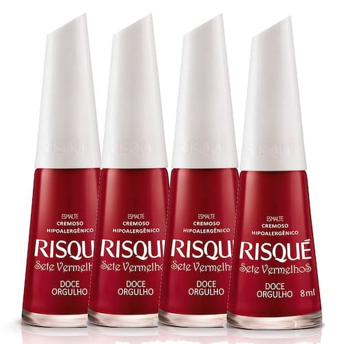 ESMALTE RISQUÉ 7 VERMELHOS COR DOCE ORGULHO HPOALERGÊNICO O vermelho é um clássico da beleza feminina. Com suas diferentes nuances, a cor realça a feminilidade da mulher e traz glamour e ousadia aos looks.