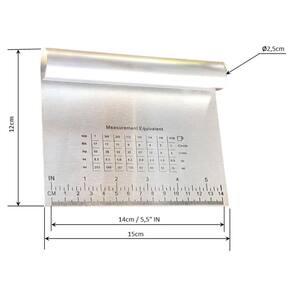 Fabricada em aço inoxidável de alta qualidade com cabo tubular. Produto higiênico e resistente, possui uma régua medidora escala de 5,5 polegadas ou 14 centímetros que auxilia no preparo dos alimentos que exigem um tamanho especifico. útil para cortar, separar, raspar, confeitar, transferir e organizar durante o preparo de massas, legumes e trabalhos confeitaria. Também adequada para dividir massas cruas, cortar bolos, rocamboles, pizzas entre outros. Lavar sempre com água morna e esponja macia com sabão neutro. Não utilizar produtos abrasivos e palha de aço. Pode ir à máquina de lavar- louças. Para maior durabilidade a peça deverá permanecer sempre limpa e seca quando não estiver em uso.