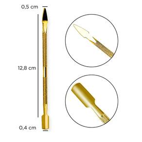 Contém: 01 - Espátula Duas Pontas Curva e para Cutículas. 01 - Espátula Duas Pontas Reta e para Cutículas. 01 - Espátula Duas Pontas Fina Arredondada e para Cutículas. 01 - Espátula Duas Pontas Ponta Formato Lança e para Cutículas. O kit completo para o cuidado das unhas e cutículas, em manicures ou espaços de podologia Ideais para ter na bolsa e fazer o cuidado em casa. Itens feitos de aço inoxidável com alta estabilidade, design ergonômico e funcionalidade versátil para a remoção de cutículas, unhas encravadas, peles e entre outros. Cada ponta possui um formato, sendo kit completo e versátil, perfeito para você. Com 4 pontas diferentes para entregar profissionalismo ao seu atendimento ou cuidado, possuem relevos em seu cabo que não deixa as espátulas escorregarem Disponível na cor dourado que não desbota e trás elegância aos itens. Características Principais: - Todas possuem duas pontas; - Pontas arredondadas; - Pontas levemente curvadas e afiadas; - Para cutículas; - Para unhas encravadas; - Auxilia no cuidado com as unhas; - Pode ser esterilizada; - Alta qualidade; - Aço inoxidável sueco; - e doméstico. - 4 peças com duas pontas cada. Medidas descritas detalhadamente nas fotos do anúncio. Boas Compras ;