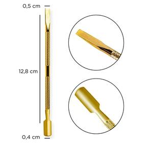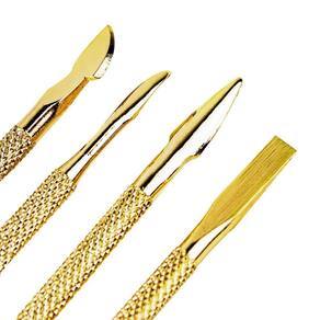 Contém: 01 - Espátula Duas Pontas Curva e para Cutículas. 01 - Espátula Duas Pontas Reta e para Cutículas. 01 - Espátula Duas Pontas Fina Arredondada e para Cutículas. 01 - Espátula Duas Pontas Ponta Formato Lança e para Cutículas. O kit completo para o cuidado das unhas e cutículas, em manicures ou espaços de podologia Ideais para ter na bolsa e fazer o cuidado em casa. Itens feitos de aço inoxidável com alta estabilidade, design ergonômico e funcionalidade versátil para a remoção de cutículas, unhas encravadas, peles e entre outros. Cada ponta possui um formato, sendo kit completo e versátil, perfeito para você. Com 4 pontas diferentes para entregar profissionalismo ao seu atendimento ou cuidado, possuem relevos em seu cabo que não deixa as espátulas escorregarem Disponível na cor dourado que não desbota e trás elegância aos itens. Características Principais: - Todas possuem duas pontas; - Pontas arredondadas; - Pontas levemente curvadas e afiadas; - Para cutículas; - Para unhas encravadas; - Auxilia no cuidado com as unhas; - Pode ser esterilizada; - Alta qualidade; - Aço inoxidável sueco; - e doméstico. - 4 peças com duas pontas cada. Medidas descritas detalhadamente nas fotos do anúncio. Boas Compras ; Marca: Não Informado Ean: 7908639608181