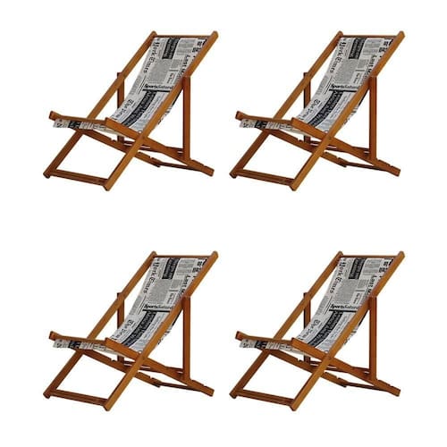 Kit 4 Espreguiçadeira Preguiçosa Dobrável Mel Sb-jornal 4 ESPREGUIÇADEIRAS ENVERNIZADA MEL S/BSabe aquele final de tarde que você tanto espera para tirar um descanso merecido? Ou aquela viagem para a praia programada a meses com a família? Pois é, nossas cadeiras espreguiçadeira serve exatamente para esses momentos, com várias opções de cores, os tecidos além de charmosos são hidro-repelentes e se adequam a qualquer ambiente, facilmente removíveis para higienização.Estrutura 100% de madeira maciça e verniz especial, que garante sua qualidade e durabilidade, a espreguiçadeira é totalmente dobrável e reclinável (4 posições de ângulo), perfeita para seu lazer em todos os ambientes, seja ele externo ou interno, esse é o item que definitivamente não pode faltar na vida de quem de fato, quer aproveitar bons momentos! FICHA TÉCNICA DO PRODUTO:04 Níveis de Regulagem de Altura;Tecido Reforçado;Fabricada em Madeira Maciça Pinus;Peso aproximado: 7,5 Kg;Suporta aproximadamente 120 kg;Cor da Madeira: Mel;Acabamento: Envernizada Dimensões aproximadas do Produto:Altura 1: 69 cm;Altura 2: 82 cm;Altura 3: 91 cm;Altura 4: 100 cm;Profundidade: 105 cm. Dimensão aproximada total:Comprimento: 135 cm;Largura: 60 cm; Informações Adicionais:Garantia: 90 dias contra defeitos de fabricação.Acompanha 4 cadeiras Obs. A cor pode variar da foto conforme a tonalidade da madeira e iluminação..