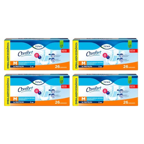 Fralda Geriátrica Tena Confort Tamanho M 26 Unidades Pacote Econômico A Fralda Geriátrica Descartável TENA Confort é indicada para uso diurno e noturno, especialmente para usuários acamados ou com pouca mobilidade que enfrentam incontinência urinária e fecal severa. Também é recomendada para cuidados pós-parto e pós-operatório, oferecendo proteção segura e conforto prolongado. Equipado com a tecnologia exclusiva AquiDry, o produto absorve e distribui rapidamente a urina, mantendo a pele até 4 vezes mais seca e reduzindo o risco de irritações e infecções cutâneas. Seus canais de distribuição aceleram a absorção, diminuindo o tempo de contato do líquido com a pele e evitando o retorno da umidade. A fralda possui altas barreiras laterais que garantem proteção extra contra vazamentos, proporcionando mais segurança para o usuário durante o uso. Seu design anatômico e a cobertura interior em material não tecido conferem maior conforto e toque macio à pele, essencial para pacientes com sensibilidade. Para maior praticidade, a Fralda TENA Confort conta com indicador de umidade, que sinaliza o momento ideal para a troca. Além disso, oferece controle eficaz de odores, neutralizando cheiros indesejados. Produto hipoalergênico, atóxico e testado para garantir segurança e qualidade no cuidado diário. · Uso diurno e noturno para máxima proteção · Indicada para usuários acamados e com pouca mobilidade · Tecnologia AquiDry mantém a pele 4x mais seca · Canais que aceleram absorção e evitam retorno de líquido · Altas barreiras laterais contra vazamentos · Design anatômico com toque macio e confortável · Indicador de umidade facilita a troca no momento certo · Controle eficaz de odores indesejados · Produto hipoalergênico e atóxico para pele sensível · Ideal para incontinência severa, pós-parto e pós-operatório