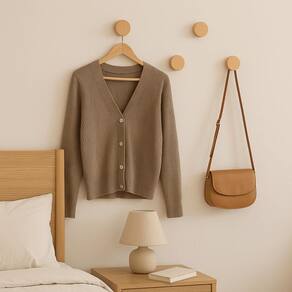 O conjunto com 4 cabideiros de parede em madeira pinus é a escolha ideal para quem busca praticidade aliada a um design minimalista e natural. Com acabamento suave e formato redondo, os ganchos se adaptam facilmente a diversos ambientes, como quartos, banheiros, hall de entrada, cozinhas e espaços comerciais. Produzidos em madeira maciça de pinus de reflorestamento, cada peça é cuidadosamente lixada para um toque agradável e elegante. perfeitos para pendurar roupas, bolsas, chapéus, toalhas ou acessórios, também funcionam como itens decorativos. Podem ser posicionados em fileira, zigue-zague ou como preferir, criando composições únicas e funcionais de acordo com seu estio.