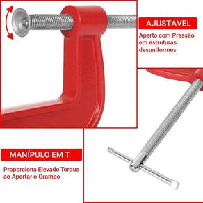 Grampo Sargento 6 Pol. 150mm Tipo C. Corpo em ferro fundido, Fuso em aço especial. Utilizado em marcenarias para firmar ou prender peças que necessitem ser trabalhadas ou coladas.