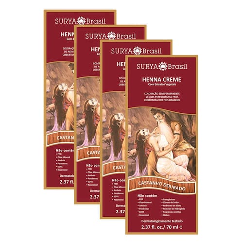HENNA CREME SURYA BRASIL CASTANHO DOURADO Coloração semipermanente de alta performance para cobertura dos fios brancos. A Henna Creme oferece uma maneira segura e natural para cobrir fios brancos ou tonalizar os cabelso, além de simultaneamente condicioná-los e tonalizá-los mais fortes. Desenvolvida como um tratamento de beleza, sua textura é sedosa e seu aroma é agradável. Produto vegano, com matérias-primas naturais e livres de crueldade, sem nenhum ingrediente de origem animal e sem testes em animais. Fácil de aplicar.