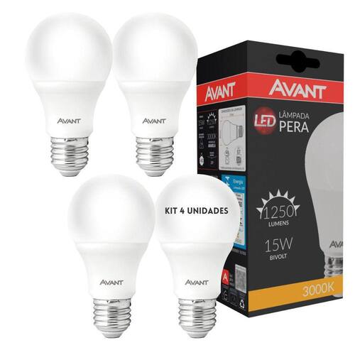 Kit com 4 Lâmpadas Led 15W Soquete E27 6500K Branca Fria Avant. Lâmpadas Led Avant de 15W, ideais para substituir lâmpadas incandescentes ou fluorescentes em ambientes internos. Com base em alumínio e corpo em plástico, possuem temperatura de cor branca fria 6500K e são bivolt, podendo ser utilizadas em voltagens de 110V a 240V. Com fluxo luminoso de 1311 e eficiência luminosa de 87 lm/W, proporcionam iluminação eficiente. Índice de proteção IP20. Vida útil aproximada de 25 mil horas. Base E27 para fácil instalação. Tamanho compacto de 6x11cm. Garantia de fábrica de 90 dias. Ean: 7893590741896