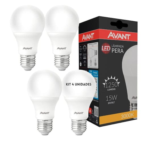 Kit com 4 Lâmpadas Led 15W Soquete E27 6500K Branca Fria Avant. Lâmpadas Led Avant de 15W, ideais para substituir lâmpadas incandescentes ou fluorescentes em ambientes internos. Com base em alumínio e corpo em plástico, possuem temperatura de cor branca fria 6500K e são bivolt, podendo ser utilizadas em voltagens de 110V a 240V. Com fluxo luminoso de 1311 e eficiência luminosa de 87 lm/W, proporcionam iluminação eficiente. Índice de proteção IP20. Vida útil aproximada de 25 mil horas. Base E27 para fácil instalação. Tamanho compacto de 6x11cm. Garantia de fábrica de 90 dias.