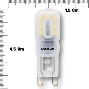 - Base: G9 - Potência: 2,5W - Voltagem: 127V - Fluxo Luminoso: 180 lm - frequência: 50/60Hz - Temperatura de Cor: 2700K branco quente , proporcionando uma iluminação energizante e clara. - Ângulo de Abertura: 300, garantindo uma distribuição ampla da luz em todo o ambiente. - Acabamento Fosco: O design fosco ajuda a suavizar a luz, evitando ofuscamentos e criando um ambiente mais confortável. - Econômica e Ecológica 90% da energia: Com tecnologia LED, essa lâmpada consome menos energia e possui uma vida útil prolongada. - Validade: Indeterminada. - Tamanho do Produto: 4,5cm altura x 1,5cm largura. - Composição do Produto: Contém polímero termoplástico, metal e componentes eletrônicos. Marca: Não Informado