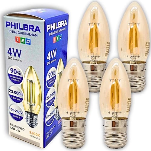 Kit 4 Lâmpadas Vintage Filamento Led Vela C37 Âmbar 2200K