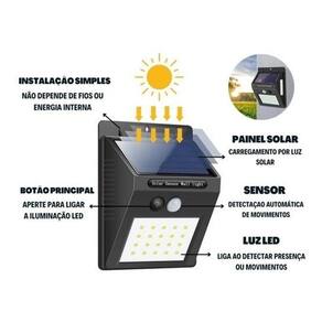 Kit 4 luminaria de led solar sensor movimento 30 led Kit 4 luminárias led saiba todos os detalhes abaixo:- quantidade: 4 luminárias- modelo: ip67- carregamento: automático através de luz solar- tipo: led, acende automaticamente com movimentos- bateria: 1200mah- comprimento: 12,4 cm- altura: 7,8 cm- largura: 9,5 cmespecificações:- painel solar: 0,55 - 17% de eficiência- bateria de íon de lítio: 3,7 v- potência led: 0,2 w- sensor noturno: ela fica acesa o dia inteiro R: não, somente a noite quando há movimentos em direção ao sensor dela.Precisa carregar na tomada ou ficar trocando pilha R: não, ela carrega sozinha em contato com o sol.Ela luminária pode ficar na água R: em caso de chuvas, sim não instale em piscinas, ela aguenta ficar alguns minutos coberta de água.Demora para instalar as luminárias R: instalação pode ser feita em 3 minutos,itens inclusos:4 luminarias de led solar com sensor Marca: Shopbr