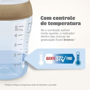 As Mamadeiras NUK Perfect Match kit com 4 unidades, são 2 mamadeiras de 150ml com bicos de fluxo lento, 2 mamadeiras de 260ml com bicos de fluxo médio e mais 2 bicos de fluxo variável (U). Todas possuem junto ao marcador de graduação do frasco o novo indicador de controle de temperatura. Se o conteúdo estiver muito quente, acima de 37º, o indicador de temperatura ficará branco, aguarde o indicador voltar a cor azul para oferecer a mamadeira.