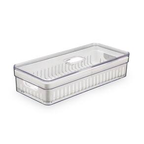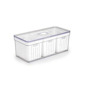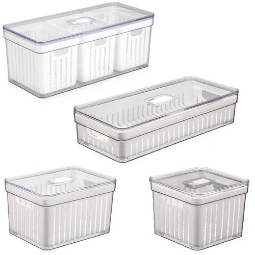- Controle de ventilação na tampa- Cestos de drenagem removíveis, ideal para conservar frutas e verduras- Estrutura resistente e durávelCOMPATIBILIDADE:- Design adaptável para a maioria dos modelos e tamanhos de geladeiras- Pode ser facilmente empilhado.VÁLVULA DE CONTROLE DE VENTILAÇÃOPara alimentos sensíveis como folhas ou vegetais que murcham, utilize a válvula fechada, exemplos: Alface, Rúcula, Beterraba, Brócolis, Couve, Repolho, Cenoura, Couve-flor, Couve, Berinjela;Para frutas ou vegetais com casca, utilize a válvula aberta, exemplos: Maçã, Manga, Abacate, Tomate, Melão, Laranja, Pêssego, Melancia, Pêra, Pepino, Pimenta, Ameixa, Uvas, Kiwi;Alimentos cortados sempre utilizar com a válvula fechada.Porta Ovos: válvula aberta.CUIDADOSNão deve ir à lava-louça, nem ao freezer ou ao micro-ondas. A limpeza é bem simples, lave com sabão neutro e esponja macia (parte amarela), evitando produtos abrasivos no processo de limpeza.INSTRUÇÕES DE USO:1. Coloque os alimentos dentro do organizador.2. Utilize a tampa para proteger os itens de odores e contaminação cruzada.3. Lave com água e sabão neutro para manter a higiene.ITENS INCLUSOS:- 01 Organizador de Geladeira Acrílico com Tampa 6,8 litros c/ 01 Cesto de Drenagem Removível- 01 Organizador de Geladeira Acrílico com Tampa 3,8 litros c/ 03 Cestos de Drenagem Removíveis - 01 Organizador de Geladeira Acrílico com Tampa 2,8 litros c/ 01 Cesto de Drenagem Removível
