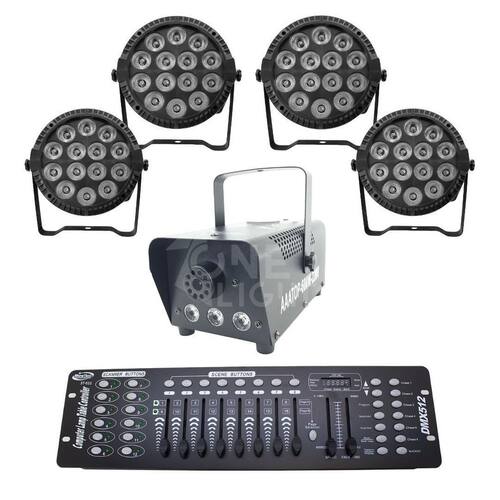 Kit 4 par led slim 14x12w + máquina de fumaça 600w + mesa dmx 512