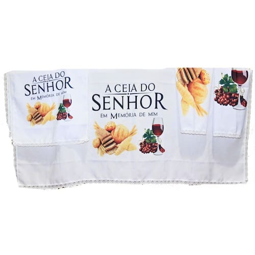 01 - toalha para mesa - medida: 1,5 x 1,5mt 01 - caminho para púlpito - medida: 1,5mt x 45cm 01 - toalha para a bandeja de pão - medida: 50 x 50cm 01 - toalha para a bandeja de cálices - medida: 50 x 50cm