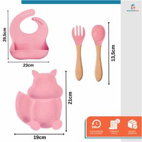 INFORMAÇÕES ADICIONAIS DIMENSÕES, PESO E CAPACIDADE Material: Silicone de qualidade alimentar Medidas babador: 29,5cm (altura) x 23cm (largura)) Medidas talher: 13,5cm (altura) Medidas prato: 25cm (altura) x 19cm (largura) Idade recomendada: +6 meses Marca: Baby Style Ref.: 5959057