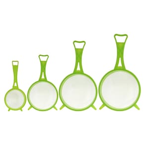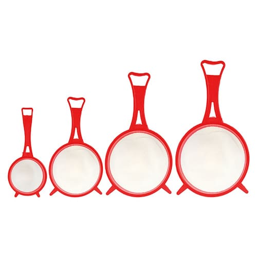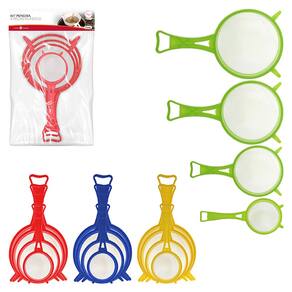 Material: Plástico resistente e durável. Cores: Coloridas (, dependendo do fabricante). Tamanhos: 6cm, 8cm, 10cm e 12cm de diâmetro. Quantidade: 04 peneiras por kit.