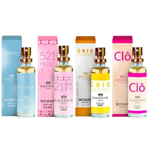 O Kit 4 Perfumes Elegance Blue Rose Vip Chic Clo Amakha Paris é perfeito para quem busca variedade e qualidade em perfumes femininos. Composto por 4 perfumes de 15ml cada, esse kit oferece fragrâncias únicas e irresistíveis.