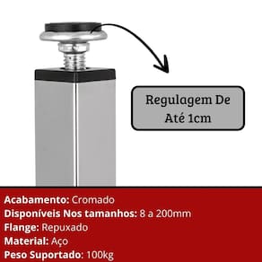 Características do Produto: Alturas disponíveis: 8cm, 10cm, 12cm, 15cm e 20cm. Regulagem ajustável: até +1cm, garantindo nivelamento em qualquer superfície. Material: Metal de alta resistência e durabilidade. Design: Moderno, quadrado e cromado, ideal para diversos estilos de decoração. Fixação segura: 4 parafusos por pé para máxima estabilidade. Capacidade de carga: Suporta até 100kg por pé.