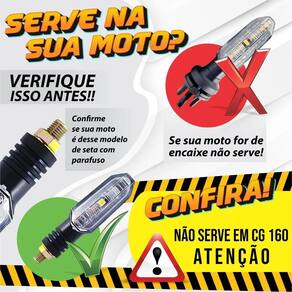 Atenção Não serve em fan cg 160-----somente em bros 160 Descrição Pisca led modelo cb 250 twister. Atenção Este pisca possuiu coxim e parafuso. Elas não serve para motos que as setas pisca são fixados apenas por coxim Não serve em motos com setas modelo novos Aplicação: Honda cbx 250 twister. 2001 a 2008 Honda cb 300. 2009 a 2015 Honda xre 190. todas Honda titan 150 - 125. modelo abaixo de 2013 Honda fan 125 - 150. modelo abaixo de 2013 Honda nxr 160 - 150 - 125. todas Honda xr 250 tornado. todas Honda cbx 200 - 150. todas ybr 125 - 150. todas fazer 150 - 250. todas xtz 125 - 150 - 250. todas xt - tdm 225. todas Suzuki yes 125 - 150. todas Dafra speed 150. todas Obs: Serve para todas as motos que utilizem parafuso para fixação como e de parafuso pode ser adaptado em qualquer moto,nâo nos responsabilizamos por nenhuma estalaçâo ou adaptação Descrição: Produto elaborado com material de alta qualidade, testado e aprovado dentro das normas de segurança. Acompanha na embalagem: 04 pisca led. Instalação: Atenção Recomendamos que a instalação seja feita por profissional . Não nos responsabilizamos pelo mau uso do produto,não sendo estalado como manda as orientações enviado junto ao produto e pra não funcionamento do produto,não por mal uso Marca: Não Informado