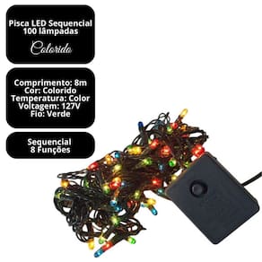 Ilumine sua decoração de Natal e eventos com o pisca LED colorido sequencial, trazendo brilho, alegria e um toque festivo para qualquer ambiente. Com 100 lâmpadas LED coloridas distribuídas em um fio verde de 8 metros de comprimento, é ideal para decorar árvores, janelas, fachadas, portas e ambientes internos ou externos cobertos.