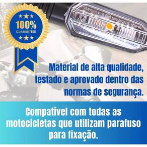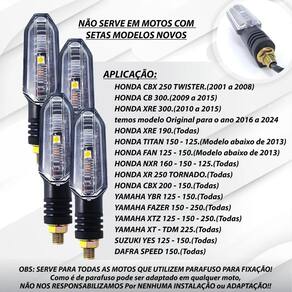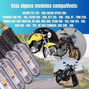 Kit 4 piscas led seta sequencial honda cb twister 250 titan Pisca led sequencial modelo cb 250 twister. Transforme sua moto com um visual moderno e esportivo O kit 4 piscas led sequenciais é a escolha ideal para quem deseja dar um toque diferenciado à moto, com design esportivo e iluminação de alta qualidade. Melhore a visibilidade e destaque-se no trânsito. atenção Este pisca possuiu coxim e parafuso. Elas não servem para motos que as setas pisca são fixados apenas por coxim atenção não serve em fan cg 160-----somente em bros 160 Não serve em motos com setas modelo novos. Aplicação: Honda cbx 250 twister. 2001 a 2008 Honda cb 300. 2009 a 2015 Honda xre 190. todas Honda titan 150 - 125. modelo abaixo de 2013 Honda fan 125 - 150. modelo abaixo de 2013 Honda nxr 160 - 150 - 125. todas Honda xr 250 tornado. todas Honda cbx 200 - 150. todas ybr 125 - 150. todas fazer 150 - 250. todas xtz 125 - 150 - 250. todas xt - tdm 225. todas Suzuki yes 125 - 150. todas Dafra speed 150. todas Características do produto: Ilumine seu caminho com segurança e estilo. Fácil instalação com apenas dois fios positivo e negativo . Estrutura resistente à água para enfrentar qualquer clima. Alta intensidade de luz com tecnologia led de baixo consumo. -lente cristal não é lente fumê . -baixo consumo de energia - leds econômicos. -carcaça em abs de alta resistência. -leds de alto brilho para melhor visibilidade. -alimentação: 12v. -conexão de 2 fios para instalação simples. -design esportivo e moderno. -produzido com materiais de alta qualidade, testados conforme normas de segurança. Conteúdo da embalagem: -4 piscas led sequenciais Instalação: Desenvolvido para encaixe perfeito sem necessidade de adaptações. Recomendamos que a instalação seja realizada por um especializado para garantir o melhor desempenho. Informações importantes: Serve para todas as motos que utilizam parafuso para fixação como é de parafuso pode ser adaptado em qualquer moto. -não nos responsabilizamos por mau uso ou instalação inadequada. Marca: Não Informado