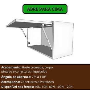 Ângulo de abertura ajustável: 75º a 110º. Sistema de amortecimento que elimina ruídos no fechamento. Conteúdo do Kit: 4 Pistões a Gás. 4 Conectores para portas. 4 Conectores para laterais. Parafusos para fixação.