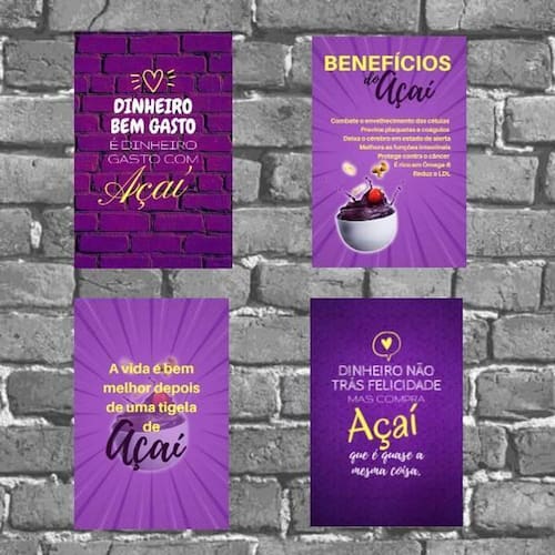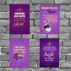 Kit 4 placas decorativas benefícios do açaí 18x27cm Informações do produto tire todas as suas dúvidas no descritivo abaixo: placas decorativas são tendência e uma excelente ideia para decorar ambientes de forma econômica e bonita, elas são leves e extremamente fáceis de instalar; além de servir para a decoração de qualquer ambiente, indo desde estabelecimentos como barbearias e bares, até quartos, sala, área de lazer, churrasqueira, etc. Ou ainda, e por que não, poder quebrar aquele galho tampando imperfeições indesejadas da parede com um toque especial