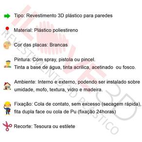 As placas são feitas de poliestireno PSAI plástico, um material resistente que não amassa e não afunda, garantindo durabilidade e beleza por muito tempo. Com tamanho de 50x50cm, exceto os modelos piramidal e prisma que possuem 48x48cm, e espessura de 1mm, as placas possuem um relevo único que traz um efeito tridimensional incrível para a parede.