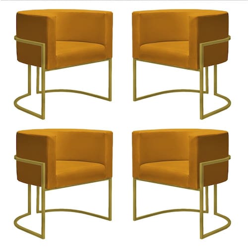 Kit 4 Poltronas Reforçadas Decorativa Sala Nayara Base Ferro Dourado Suede - Mostarda