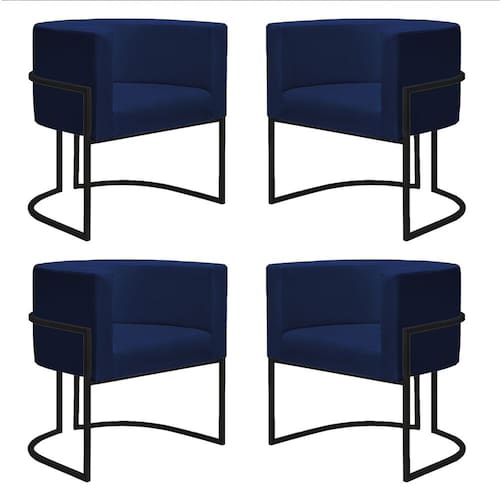 Kit 4 Poltronas Reforçadas Decorativa Sala Nayara Base Ferro Preto Suede Azul Marinho