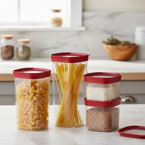 A nova linha de recipientes Modulus 110 é a solução ideal para manter seus alimentos organizados de forma impecável. Com tamanhos generosos, esses recipientes são ideais para armazenar grandes quantidades de itens, como diversos tipos de macarrão e muito mais. Seu design inteligente permite empilhá-los em armários, prateleiras, gavetas e até mesmo na geladeira, otimizando ao máximo o espaço disponível.