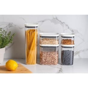 O recipiente pode ser empilhado, assim ocupando espaços reduzidos de armários e bancadas.