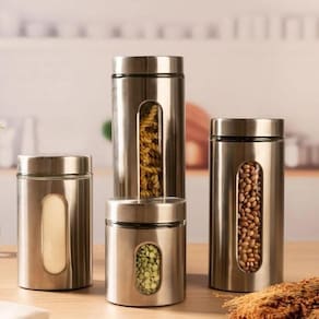 Kit Porta Mantimentos em Inox com Visor de Vidro 4 Potes Organizadores para Cozinha
