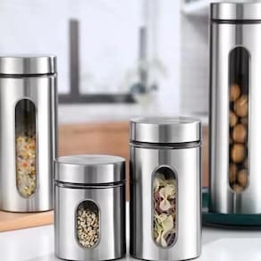 Mantenha sua cozinha organizada e seus alimentos sempre bem armazenados com o Kit de Porta Mantimentos em Inox com visor de vidro.