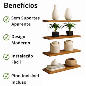 Com espessura de 15 mm, essas prateleiras são ideais para acomodar livros, vasos, porta-retratos, cosméticos, plantas e objetos decorativos. O sistema de fixação invisível deixa o ambiente mais limpo visualmente e confere um toque sofisticado à decoração.