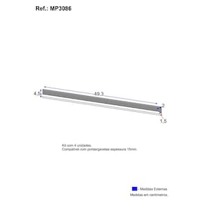 Dimensões de cada puxador: Altura: 4,5cm | Largura: 49,3cm | Profundidade: 2cm * Você pode consultar as medidas detalhadas na imagem técnica do produto. * Tamanho indicado para os parafusos: 3,5x12mm * Quantidade total necessária de parafusos: 12