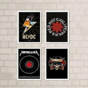 Kit 4 quadros bandas de rock 33x24cm Moldura: madeira preta Informações do produto tire todas as suas dúvidas no descritivo abaixo: decoração para quarto, sala, cozinha, escritório, área gourmet e muito mais. Chega de paredes vazias medidas - cada peça tem 33x24cm a4 . Material do papel - papel fotográfico brilhante de altíssima resolução acabamento - todos os quadros são acompanhados de uma película de acetato para proteção da imagem. - os quadros são embalados de forma segura com plástico bolha com camada dupla de acordo com o tamanho dos quadros. Garantia - garantia de 3 meses. Meu quadro chegou. Como posso fixá-lo Você precisa apenas de um martelo e um prego, pois os quadros já vão acompanhados de penduradores. Esta é a forma mais indicada. Caso prefira, você pode utilizar uma fita dupla face neste caso, sugerimos de alta qualidade para evitar que descole e seu quadro caia . Como posso limpar meu quadro A limpeza é feita como um móvel comum da sua casa. Apenas um pano seco ou espanador são suficientes para tal