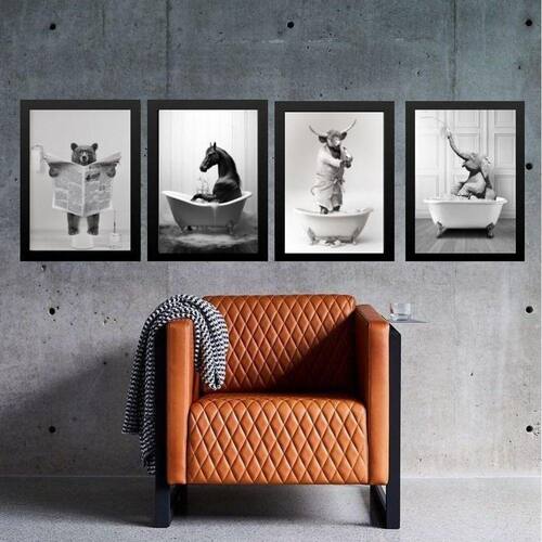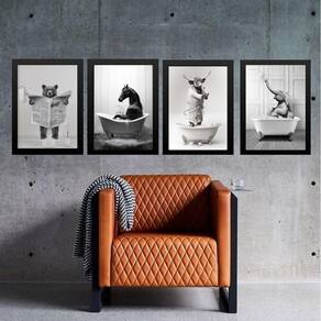Kit 4 quadros banheiro animais diversos 33x24cm - com vidro Moldura: madeira branca Informações do produto tire todas as suas dúvidas no descritivo abaixo: decoração para quarto, sala, cozinha, escritório, área gourmet e muito mais. Chega de paredes vazias medidas - cada peça tem 33x24cm a4 . Material do papel - papel fotográfico brilhante de altíssima resolução acabamento - todos os quadros são acompanhados de vidro para proteção da imagem. - moldura em madeira maciça na cor preta ou branca conforme produto escolhido e pendurador . - os quadros são embalados de forma segura com plástico bolha com camada dupla de acordo com o tamanho dos quadros. Garantia - garantia de 3 meses. Meu quadro chegou. Como posso fixá-lo Você precisa apenas de um martelo e um prego, pois os quadros já vão acompanhados de penduradores. Esta é a forma mais indicada. Como posso limpar meu quadro A limpeza é feita como um móvel comum da sua casa. Apenas um pano seco ou espanador são suficientes para tal