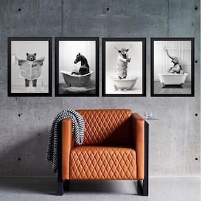 Kit 4 quadros banheiro animais diversos 33x24cm Moldura: madeira branca Informações do produto tire todas as suas dúvidas no descritivo abaixo: decoração para quarto, sala, cozinha, escritório, área gourmet e muito mais. Chega de paredes vazias medidas - cada peça tem 33x24cm a4 . Material do papel - papel fotográfico brilhante de altíssima resolução acabamento - todos os quadros são acompanhados de uma película de acetato para proteção da imagem. - os quadros são embalados de forma segura com plástico bolha com camada dupla de acordo com o tamanho dos quadros. - de 3 meses. Meu quadro chegou. Como posso fixá-lo Você precisa apenas de um martelo e um prego, pois os quadros já vão acompanhados de penduradores. Esta é a forma mais indicada. Caso prefira, você pode utilizar uma fita dupla face neste caso, sugerimos de alta qualidade para evitar que descole e seu quadro caia . Como posso limpar meu quadro A limpeza é feita como um móvel comum da sua casa. Apenas um pano seco ou espanador são suficientes para tal Ean: 7898156318918